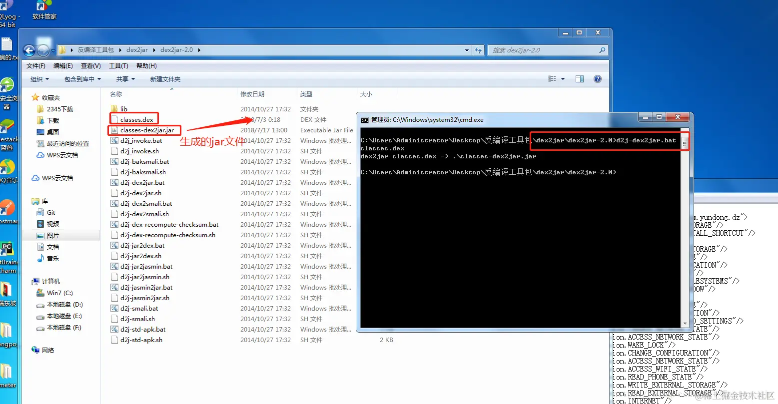 四、将classes.dex打包成jar包 需要用到dex2jar,同样的方法,解压dex2jar.zip之后,在其文件夹打开cmd命令窗口将第三步中的classes.dex放到此目录 输入命令 d2j-dex2jar.bat classes.dex 看下图