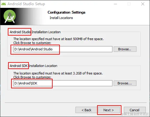 (5)这里分别改成:D:\Android\Android Studio 和 D:\Android\SDK