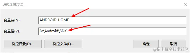 变量名:ANDROID_HOME 变量值:D:\Android\SDK