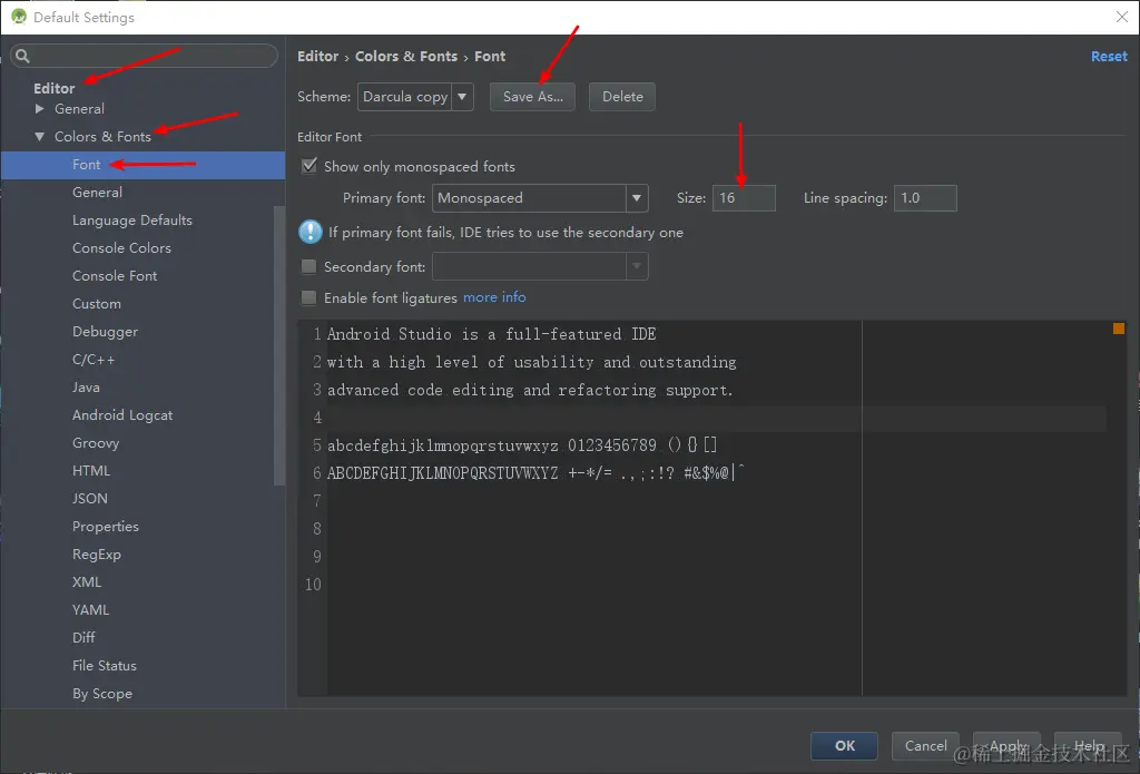 点击Save As,然后才能开始修改字体大小 Size, 改成16就好了 (至于字体样式看个人习惯,我这里直接默认)
