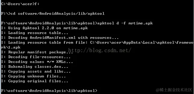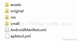 第三步:在cmd命令行中输入命令 apktool d -f 应用程序名,得到以apk名字命名的文件夹,里面可以直接看到res目录下的资源文件和Android的清单文件,但是看不到Java文件