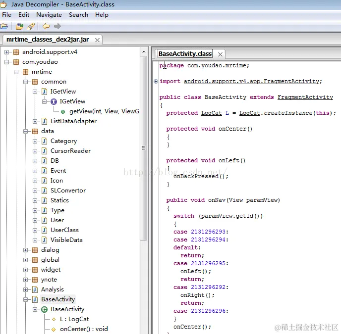 第五步:选中“dex转jar”操作,然后将得到的dex文件拖动到源文件中;点击“操作”,得到jar文件,jd工具会自动打开jar文件,这样就看到java源码了(如果应用进行了混淆,看到的源码类和方法都是abc等)