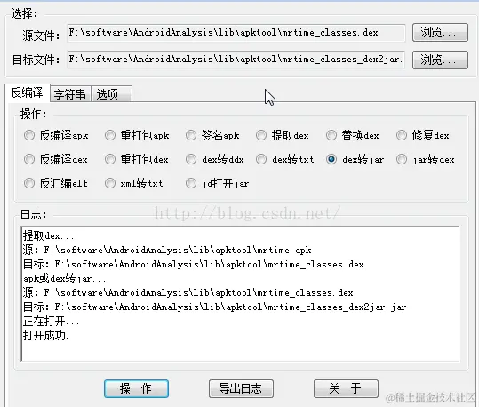 第四步:双击打开Android逆向助手.exe,选中“提取dex”操作,然后将lib\apktool目录下的apk拖动到源文件中;点击“操作”,得到dex文件