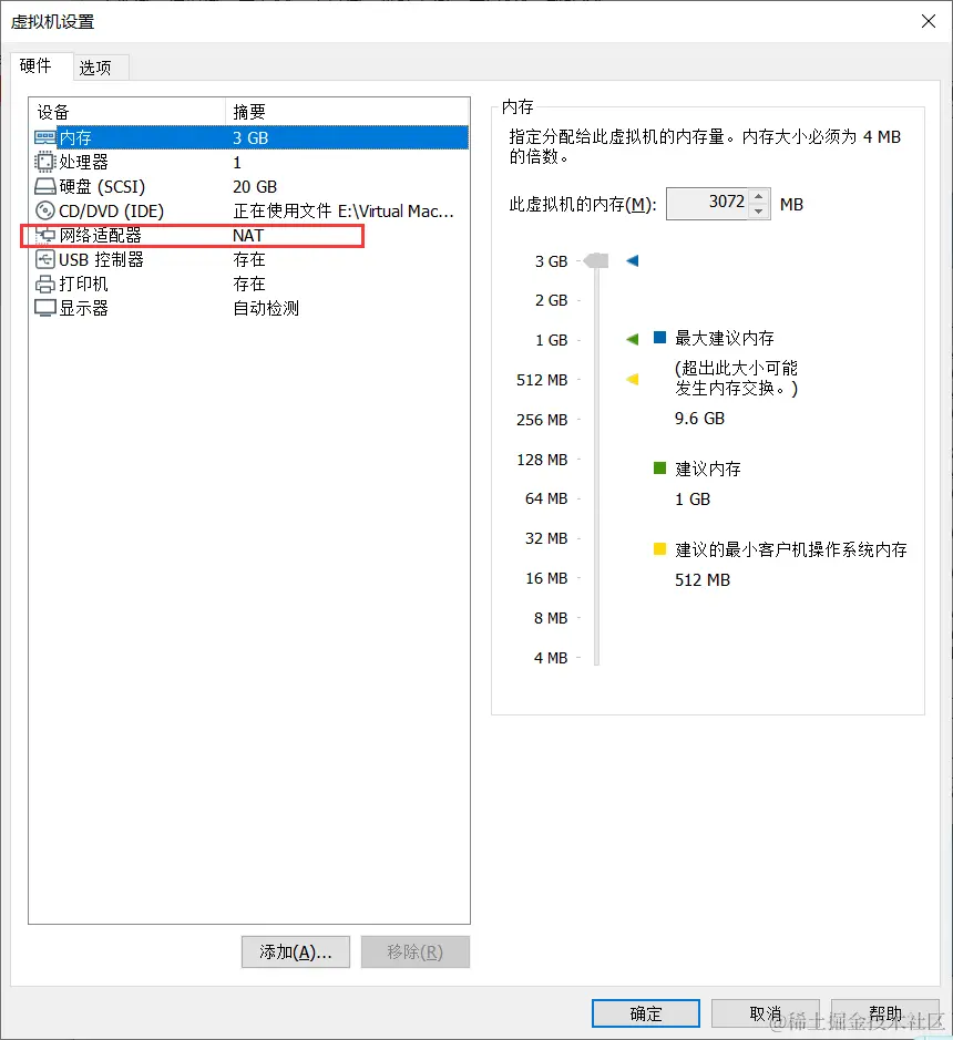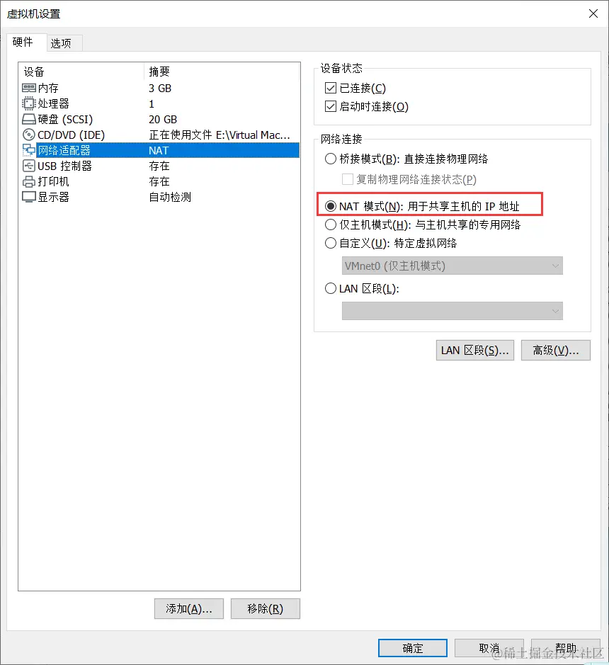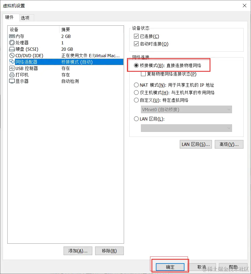 查看虚拟机配置,设置虚拟机网路为桥接模式