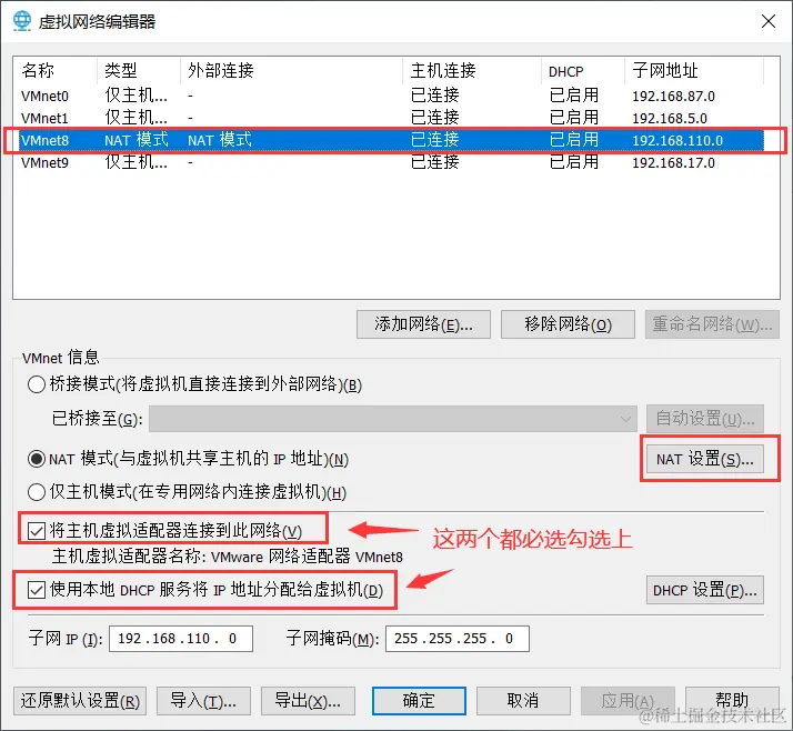 选中有 “NAT模式” 的那行记录,然后确保图中标记的两个勾必须打上,如果没有默认勾选,应该手动勾选 。然后点击 “NAT设置”