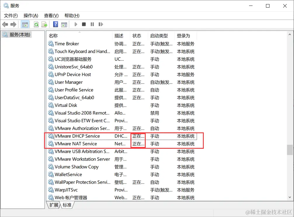 保证本地电脑的 服务 里面的 VMware DHCP service 和 VMware NAT service 两个服务是启动的。