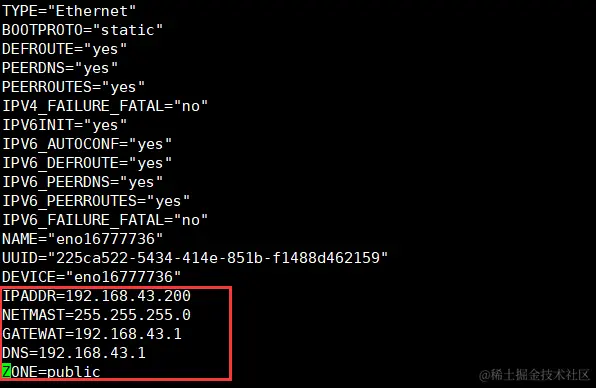 添加网关及设置静态IP(IP,网关根据自己网络修改,DNS配置为自己电脑上网的DNS即可)IPADDR 一般可设置为本机 ip 基础上最后加一或加二