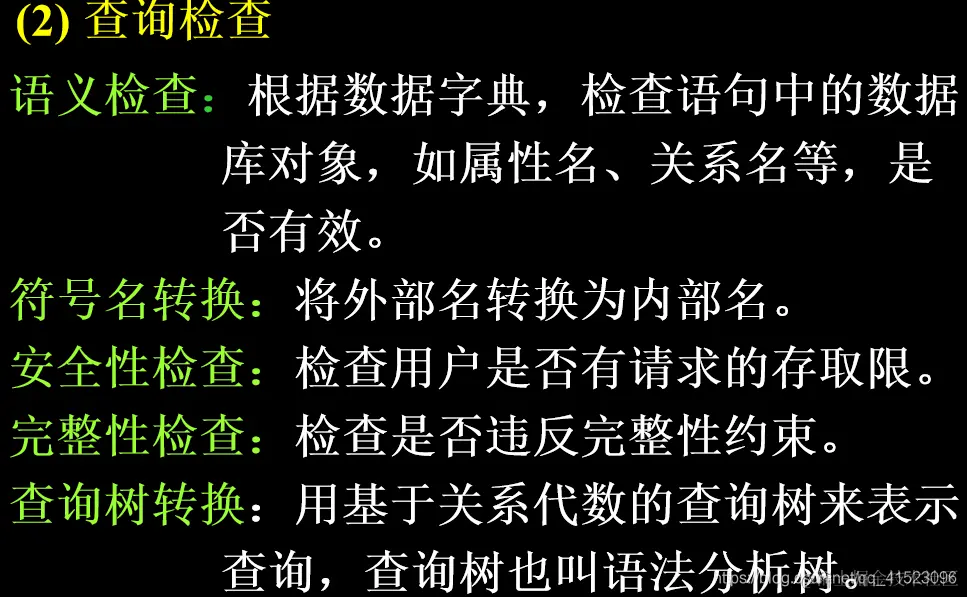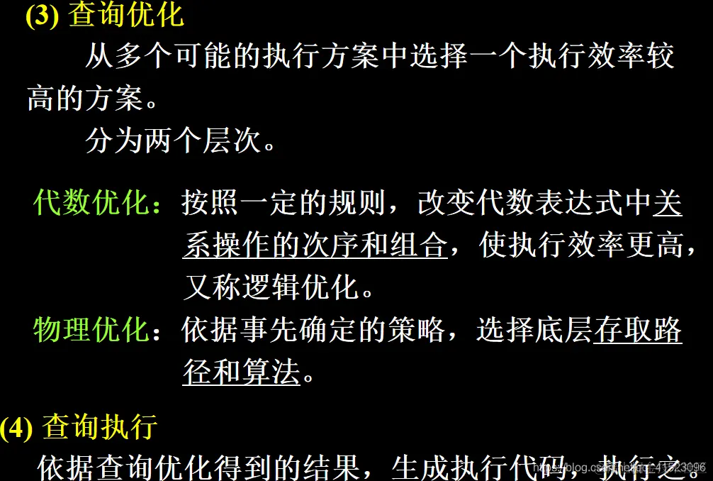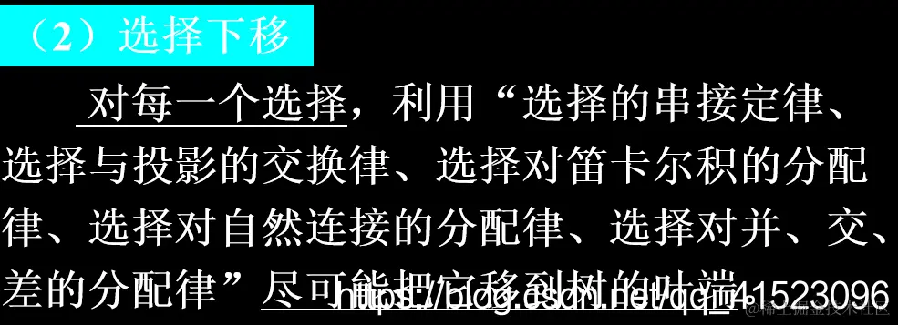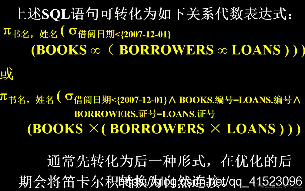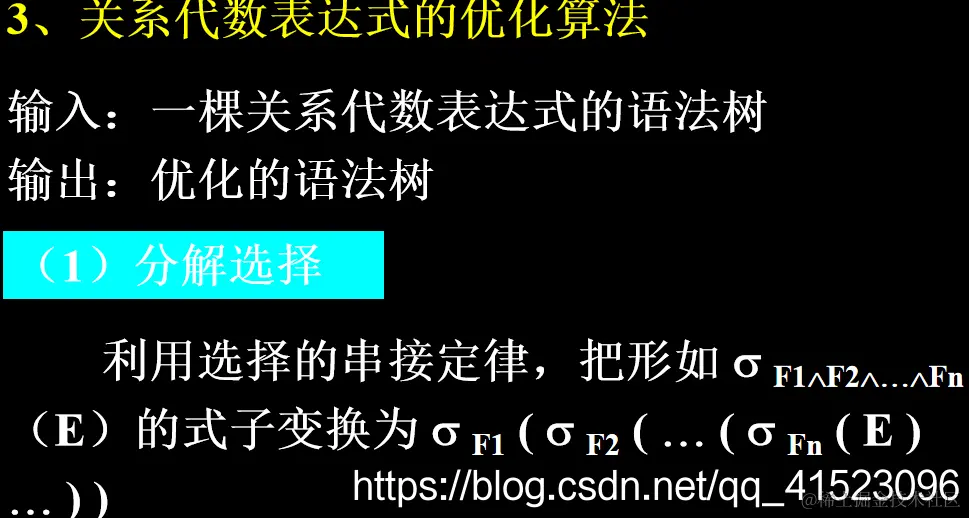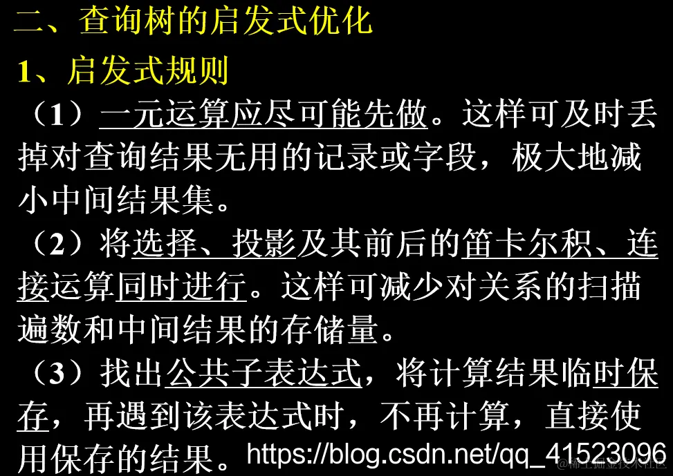 《数据库系统概论》| 第九章 关系查询处理与优化 知识梳理 TwcatL_tree 2023-12-12 62 阅读1分钟 关系查询处理与优化 目录 关系查询处理与优化 9.1 关系数据库系统的查询处理 9.2 关系数据库系统的查询优化 9.3 代数优化 查询树的启发式优化 9.4 物理优化 1、查询处理步骤 2、查询树的启发式优化规则(P284) 习题:P290 5 综合题 9.1 关系数据库系统的查询处理 9.2 关系数据库系统的查询优化 9.3 代数优化 查询树的启发式优化 9.4 物理优化