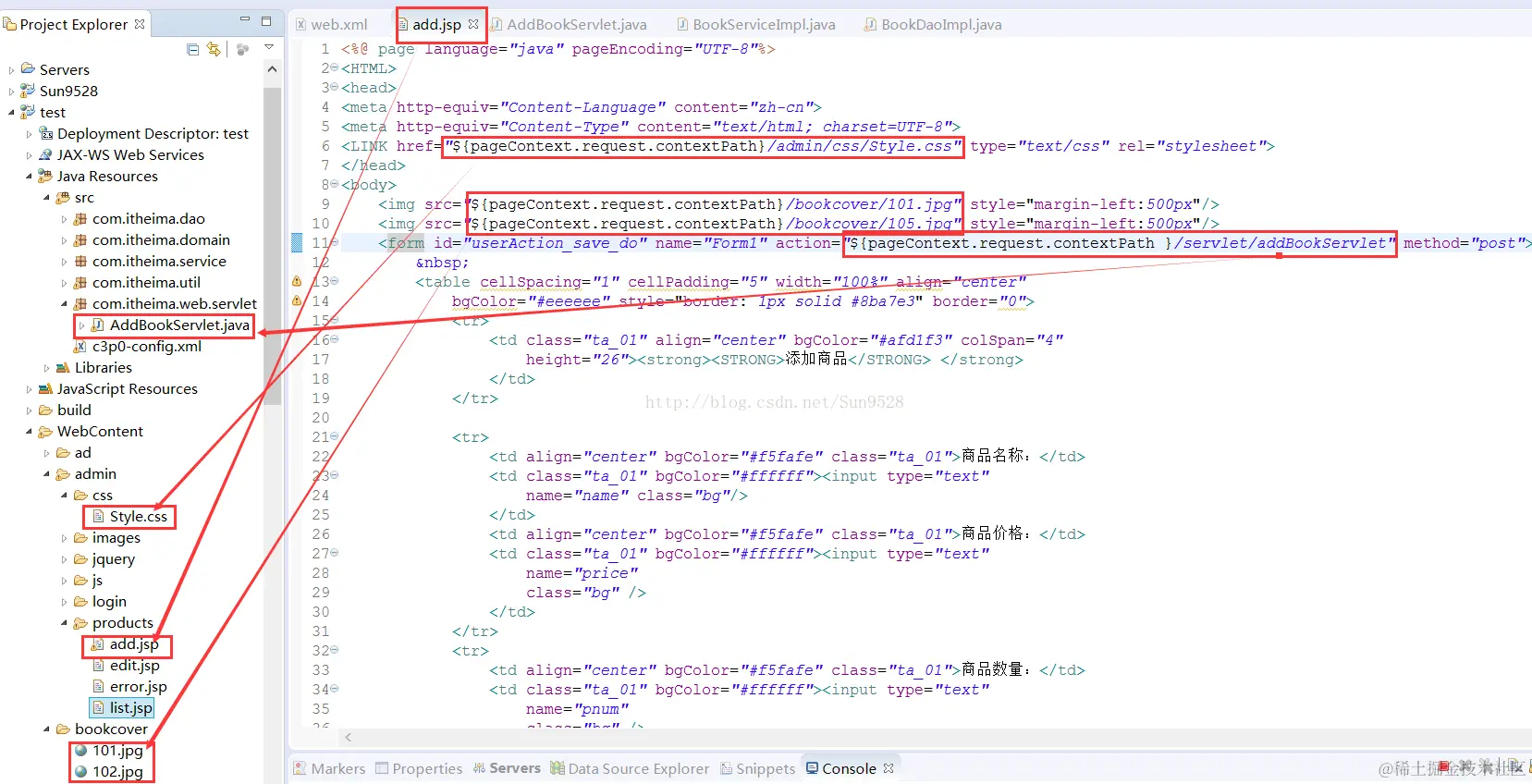 对于图片文件,如图二所示“${pageContext.request.contextPath}/bookcover/101.jpg”使用的是绝对路径,${pageContext.request.contextPath}返回的是”/test”【注意:很多地方写的返回值是“test/”,这是不对的】,拼接之后路径就变成:“/test/bookcover/101.jpg”。如果使用相对路径则为:“../../bookcover/101.jpg”(相对于add.jsp页面)。其他的CSS文件、Js文件、Jsp文件与图片文件相似,使用方法一样。