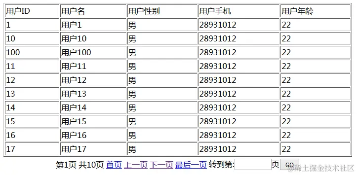 这里总共查询了100条记录,如果一次性显示的话表格会很多行,用户体验不佳。而我们采用分页显示的话,一页显示10条记录,共十页。用户可以自行翻阅,记录少,清晰显示。