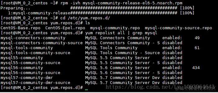 (4)rpm -ivh mysql-community-release-el6-5.noarch.rpm 接着执行这句,解释一下,这个rpm还不是mysql的安装文件,只是两个yum源文件,执行后,在/etc/yum.repos.d/ 这个目录下多出mysql-community-source.repo和mysql-community.repo;