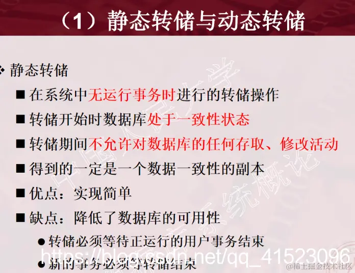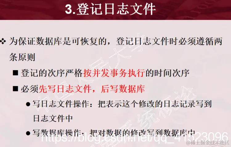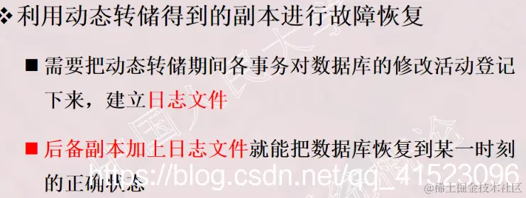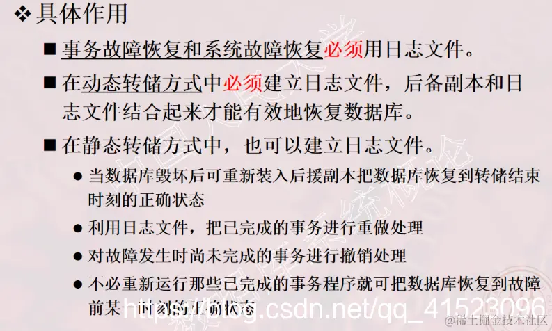 1、事务的概念 2、事务的ACID特性 3、事务故障的种类(注意:要加上计算机病毒) 4、数据转储指什么?有哪几种方法? 5、日志文件的作用是什么?登记日志文件所要遵循的原则。 6、事务故故障的恢复。
