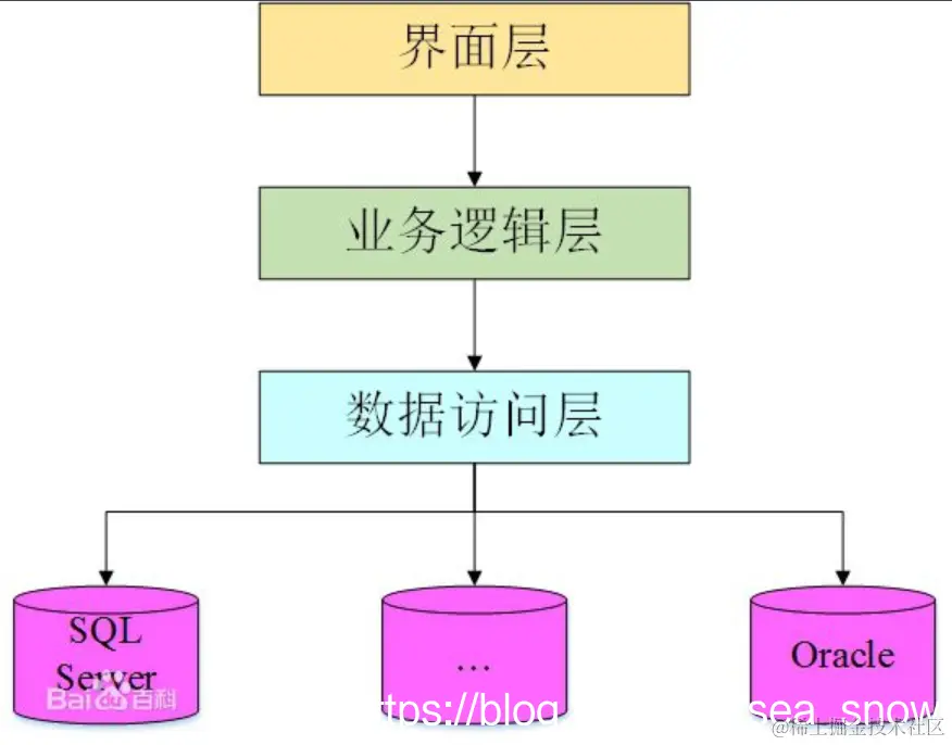 与C/S架构只有两层不同的是,B/S架构有三层,分别为: