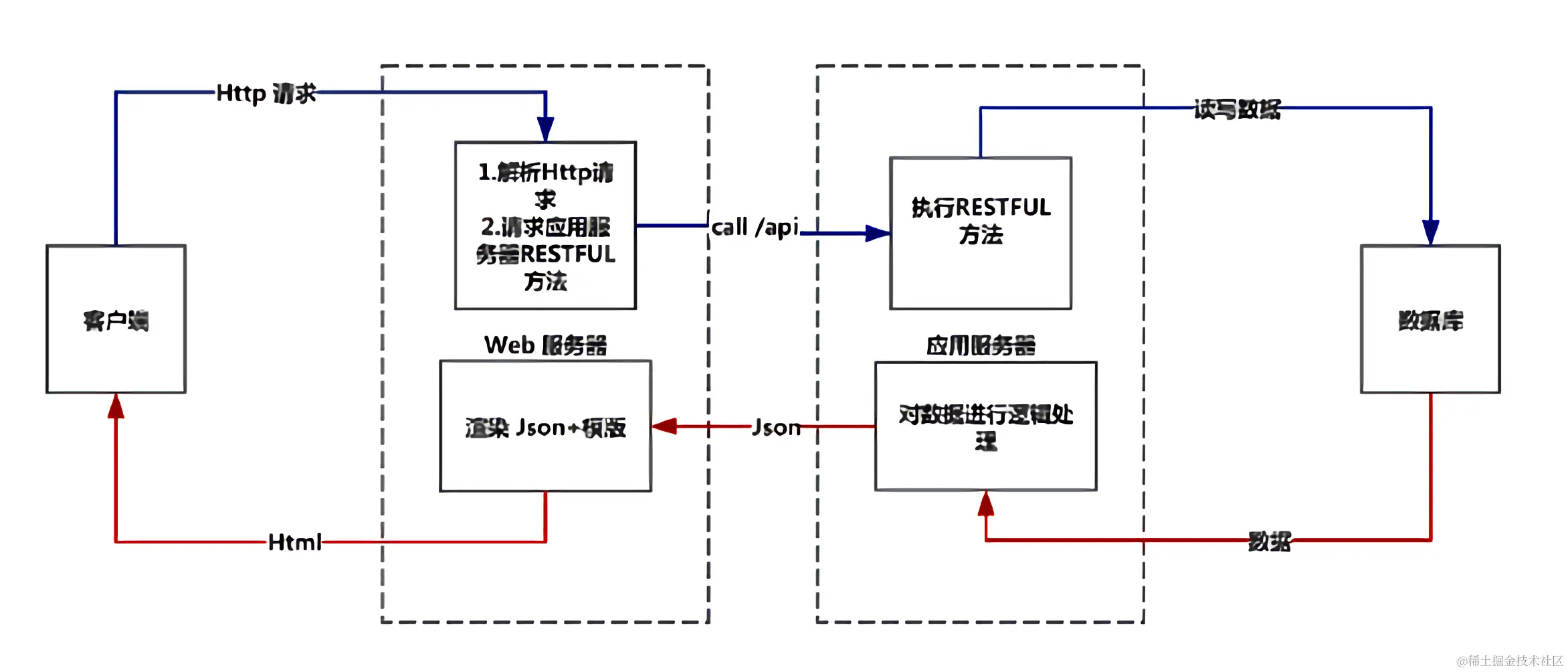 3 应用服务器的RESTFUL接口被调用,会执行对应的暴露方法.如果有必要和数据库进行数据交互,应用服务器会和数据库进行交互后,将json数据返回给web服务器