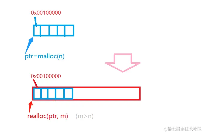 2).ptr所指内存后没有足够的空间来扩展 ,如图 :