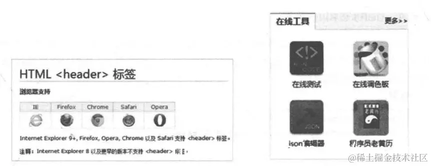 举个例子,图左这个页面中的图标图片就应该使用背景图片实现,因为这些图标并不 需要被搜索引擎识别,也不作为HTML的一部分。而图右页面中应该使用img标签来实 现,因为这是页面HTML结构的一部分,并且希望被搜索引擎识别。