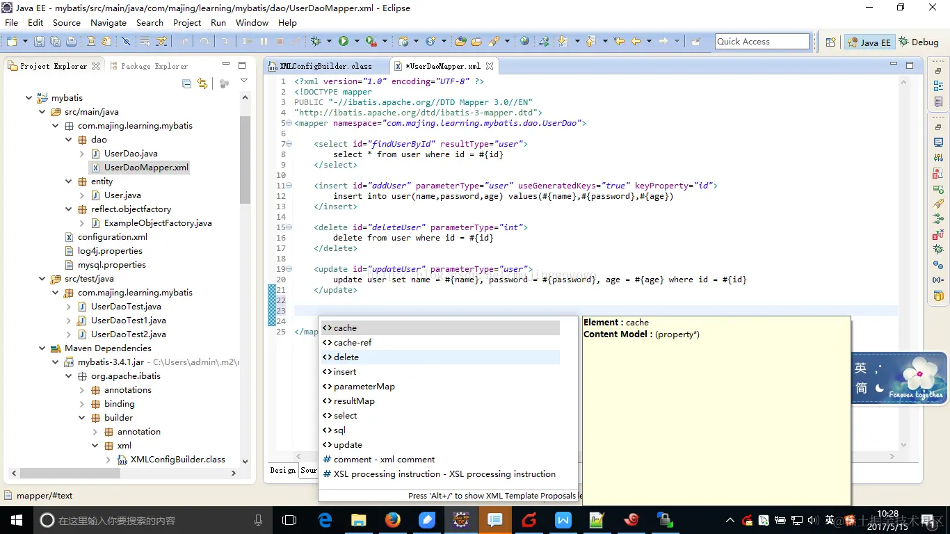 Mapper映射文件是一个xml格式文件,必须遵循相应的dtd文件规范,如ibatis-3-mapper.dtd。我们先大体上看看支持哪些配置?如下所示,从Eclipse里截了个屏: