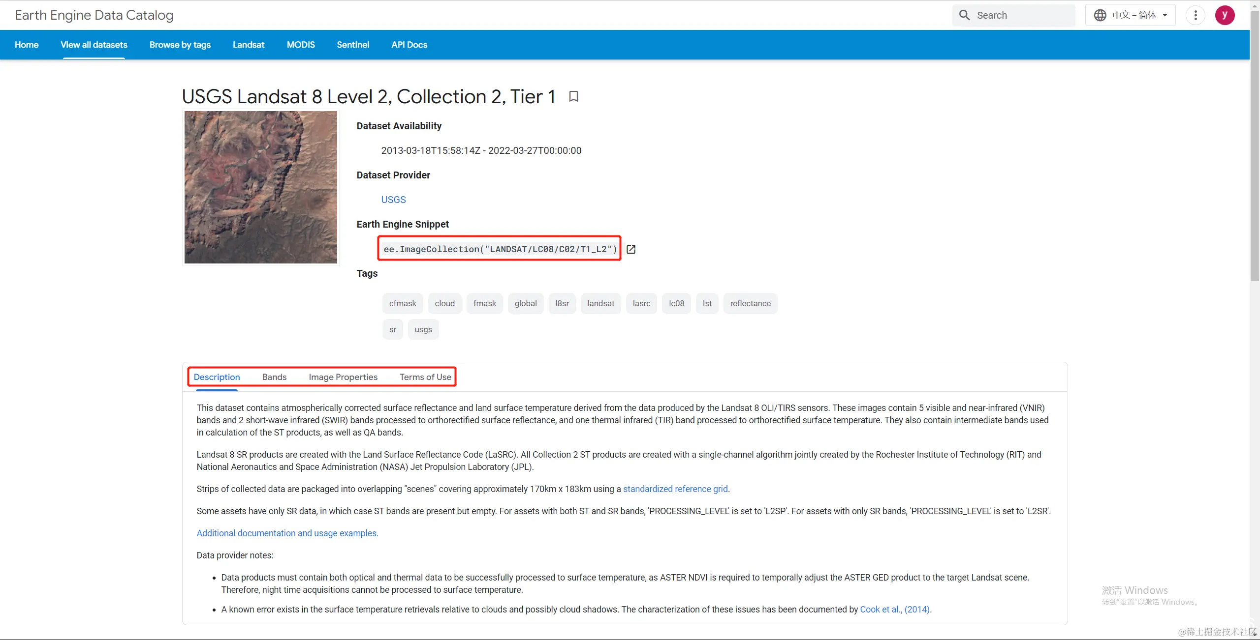 这里我们可以看到Landsat数据集来源于USGS,被分为了Collection2 和 Collection1两种产品的数据集,Collection1产品是2016年建立的,现在被Collection2所取代。我们知道USGS将产品分为了3类:①T1:满足几何和辐射质量要求的数据;②T2:不符合T1级别要求的数据;③RT:实时数据,尚未评估的数据(最多需要一个月)。