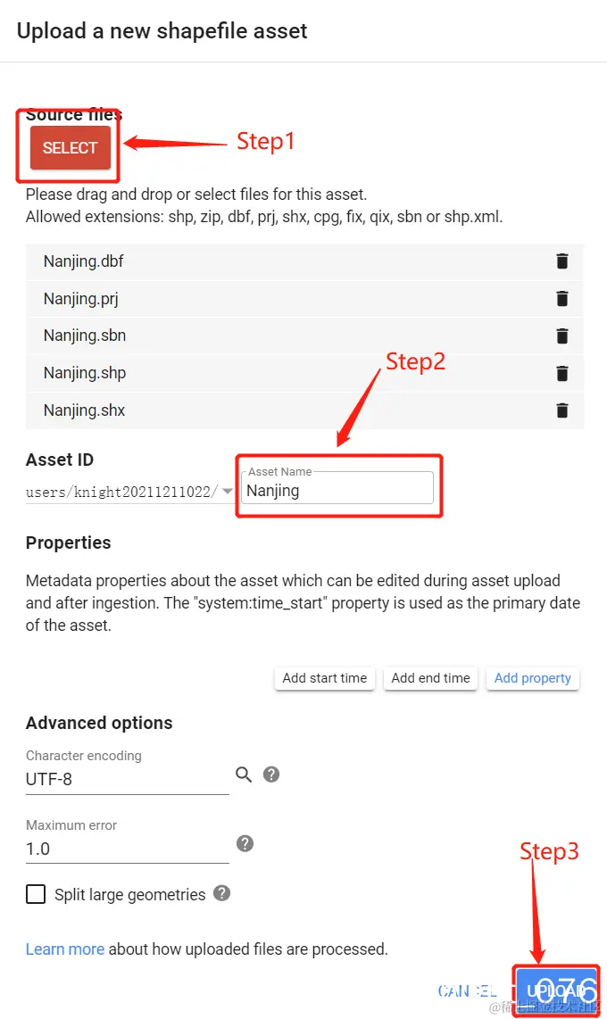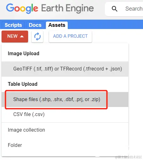 点击 “NEW” 图标,我们可以看到如图所示的选项,有栅格类型(.tiff)、矢量类型(.shp)和表格类型(.csv)等. 这里我将本地的 “Nanjing”矢量边界文件上传到GEE当中。