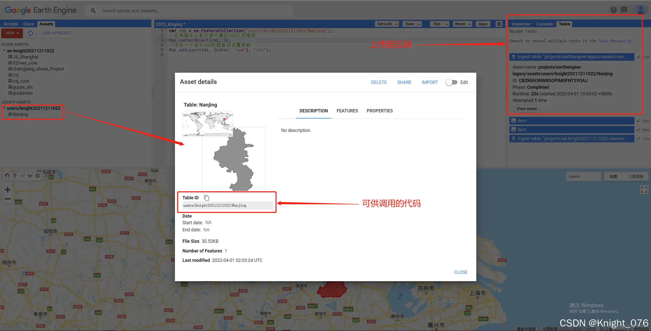上传成功后,在刷新左侧的菜单栏,可以看到刚刚上传的Nanjing矢量文件,单击进入details界面,可以看到其存放的位置同时也是调用的代码。