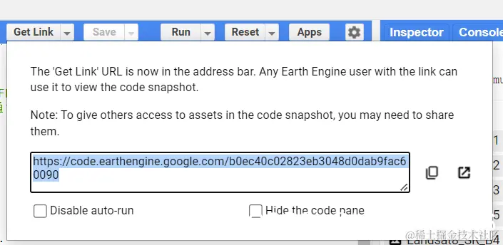 GEE的在线编译器提供共享功能,复制网址即可自动加载页面内的代码,非常实用!