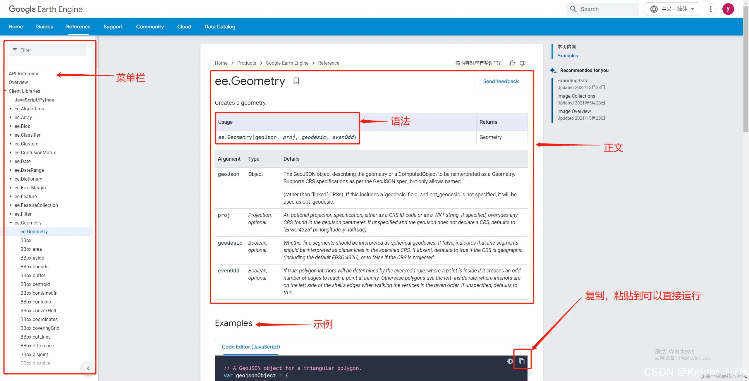 里面由详细的数据产品描述,波段组成,图像属性等等,“ee.ImageCollection("LANDSAT/LC08/C02/T1_L2")”是导入加载影像所需要的关键代码。即这里用到的是“ee.ImageCollection() ”这个API函数。如果还不够直观,下面还提供了示例,可供查看。