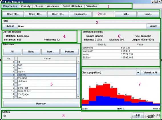 我们不打算对所有的属性离散化,只是针对对第1个和第4个属性(见区域5属性名左边的数字),故把attributeIndices右边改成“1,4”。计划把这两个属性都分成3段,于是把“bins”改成“3”。其它框里不用更改,关于它们的意思可以点“More”查看。点“OK”回到“Explorer”,可以看到“age”和“income”已经被离散化成分类型的属性。若想放弃离散化可以点区域2的“Undo”。