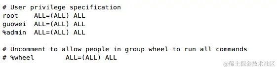 进入文件之后,找到root ALL=(ALL) ALL这条语句所在的地方,将root替换成你想要具有管理员权限的用户名(比如:guowei),在这行语句下面输入guowei ALL=(ALL) ALL,然后进行保存,如下图所示: