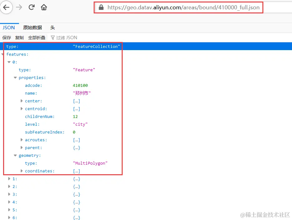 二、然后,在浏览器输入json api链接,可以看到数据格式是很规整的json数据,在浏览器中右键保存为json格式数据,如本文保存为410000_full_henan.json;