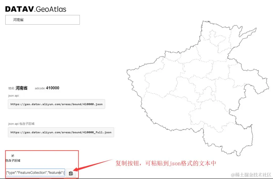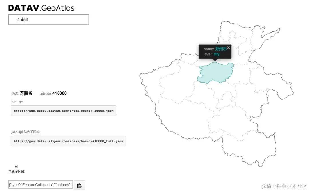 一、首先,到阿里云提供的地图选择器网站选择想要下载的行政区(链接), 网站提供的是json格式数据,也就是GeoJson格式的多边形地理空间数据。以河南省为例,选取河南省,会生成河南省边界的json api链接和包含河南省子区域的json api链接,这里子区域只提供两级,即所选的本一级和下一级: