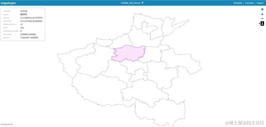 点击Export按钮,本文选择Shapefile格式,就可以得到河南省及所属市的Shp格式行政区划数据。