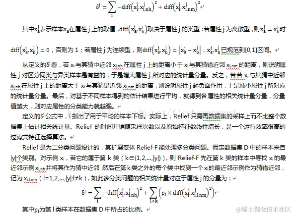 过滤式方法先对数据集进行特征选择,然后再训练学习器,特征选择过程与后续学习器无关。先用特征选择过程对初始特征进行过滤,再用过滤后的特征训练模型。Relief是一种著名的过滤式特征选择方法,该方法设计了一个相关统计量来度量特征的重要性。该统计量是一个向量,其每个分量对应于一个初始特征,而特征子集的重要性则是由子集中每个特征所对应的相关统计量分量之和决定。指定一个阈值,选择比阈值大的相关统计量分量所对应的特征即可;也可指定要选择的特征个数k,然后选择相关统计量分量最大的k个特征。