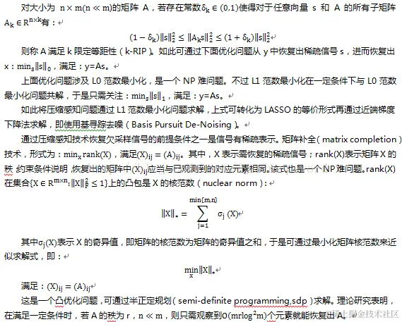 在现实任务中,常有根据部分信息来恢复全部信息的需求,如在数据通讯中将模拟信号转换为数字信号,根据奈奎斯特(Nyquist)采样定理,令采样频率达到模拟信号最高频率的两倍,则采样后的数字信号就保留了模拟信号的全部信息;换言之,由此获得的数字信号可精确重构原模拟信号。然而,为了便于传输、存储,在实践中人们通常对采样的数字信号进行压缩,这有可能损失一些信息,而在信号传输过程中,由于信道出现丢包等问题,又可能损失部分信息;如此,接收方基于收到的信号,能否精确地重构出原信号呢?压缩感知(compressed sensing)为解决此类问题提供了思路。\