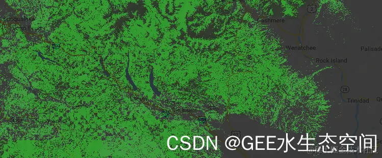 我们还可以使用调色板来突出显示分类数据。如果我们想在研究区域创建森林/非森林掩膜,我们可以使用国家土地覆盖数据集NLCD以深绿色突出显示所有森林类别。NLCD 中有许多土地覆盖类别,但为了简化此示例,我们仅在东部瀑布的同一区域使用“落叶林”、“常绿林”和“混交林”。再次启动一个新脚本并粘贴下面的代码。您应该会看到类似于下图的结果图像。