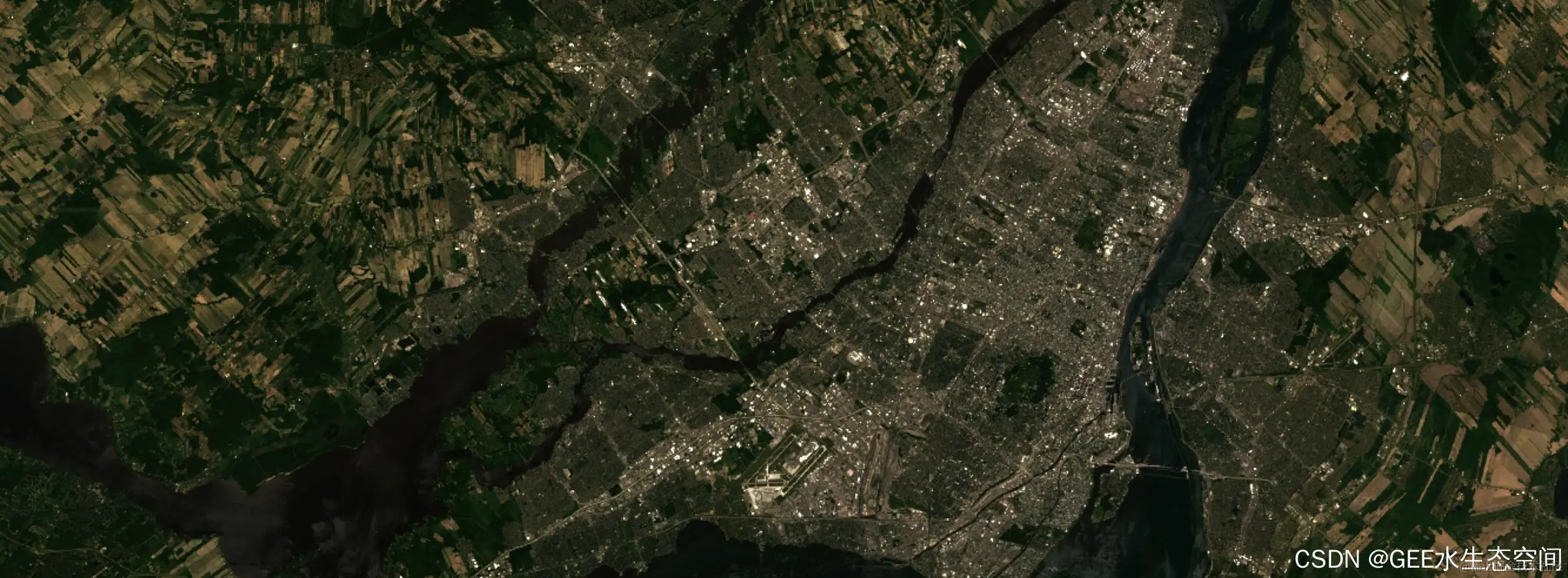 在本单元中,我们将使用许多数据集。在本节中,我们将导入 Landsat 8 表面反射率集合。我们将首先使用真彩色图像 (TCI) 来调查和解释加拿大蒙特利尔的景观。使用下面的代码应该会产生如下所示的图像。我们在新闻和网上遇到的许多基于空间的图像都是 TCI。通过使用 Google Earth Engine 中的 TCI,我们可以利用自己的经验和常识识别来对物体进行识别和分类。使用以下代码启动一个新脚本以生成如下所示的 TCI。