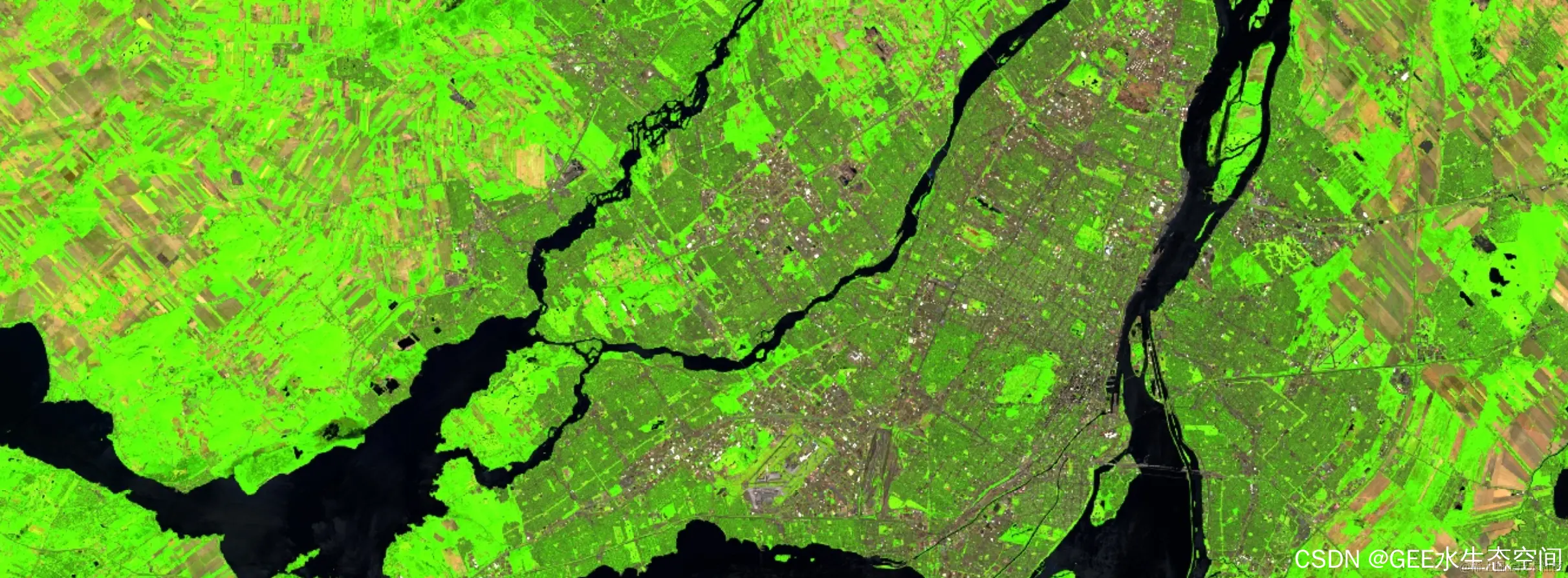 用彩色红外图像替换我们的真彩色图像,以识别加拿大蒙特利尔和周边陆地区域的活跃植被和水道区域。