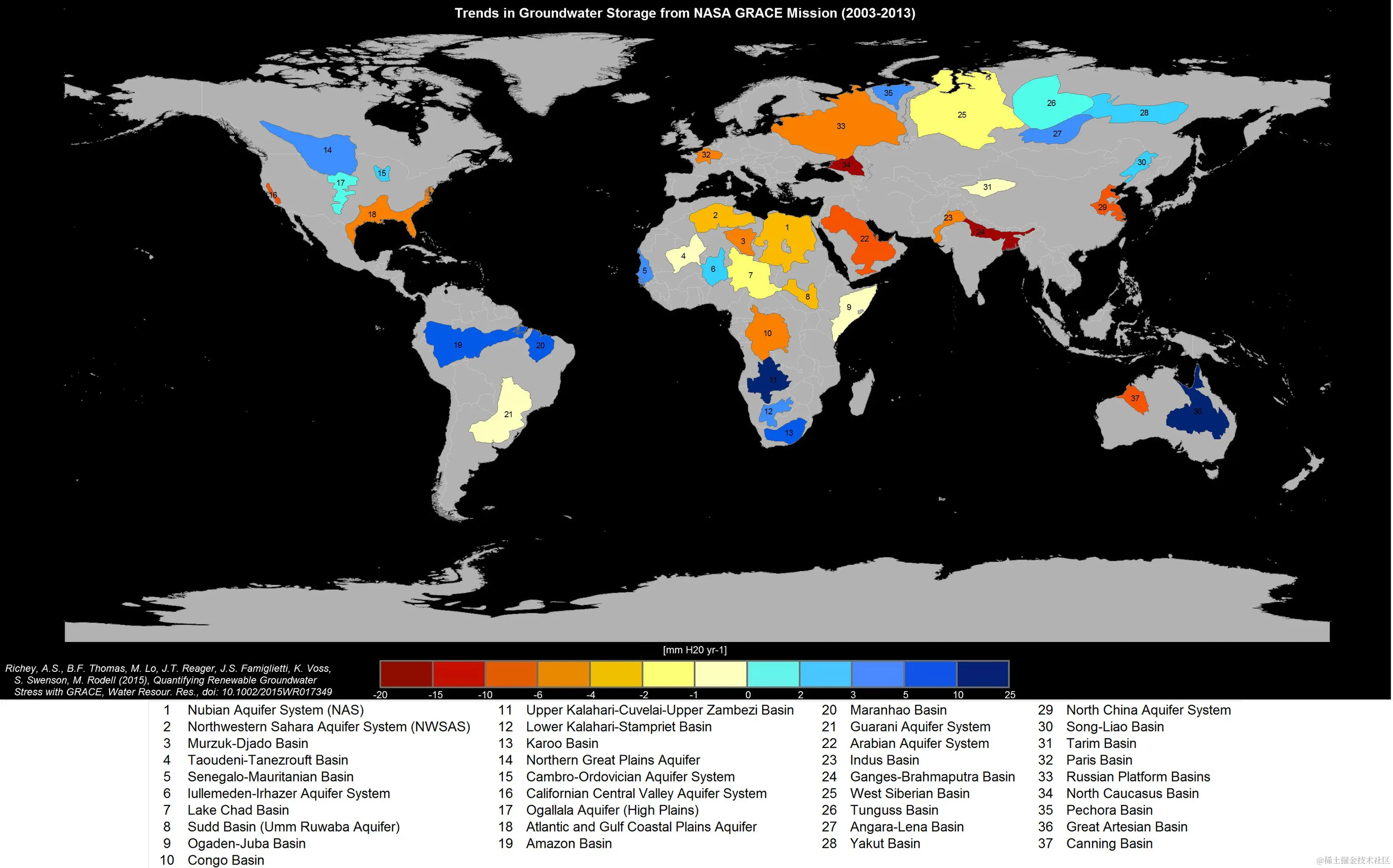 地球 37 个最大含水层地下水储量变化趋势。 在此处阅读有关此图像的更多信息。图片来源:加州大学欧文分校/NASA/JPL-Caltech。