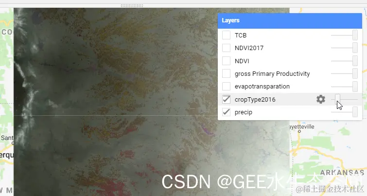 通过增加降水图像的透明度,我们可以直观地评估大面积地理区域作物类型与年降水量之间的关系。