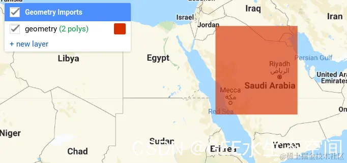 在几何导入下拉框中选择几何图层。选择后,功能名称应显示为粗体。然后,您可以在阿拉伯半岛上绘制一个新框并单击运行。