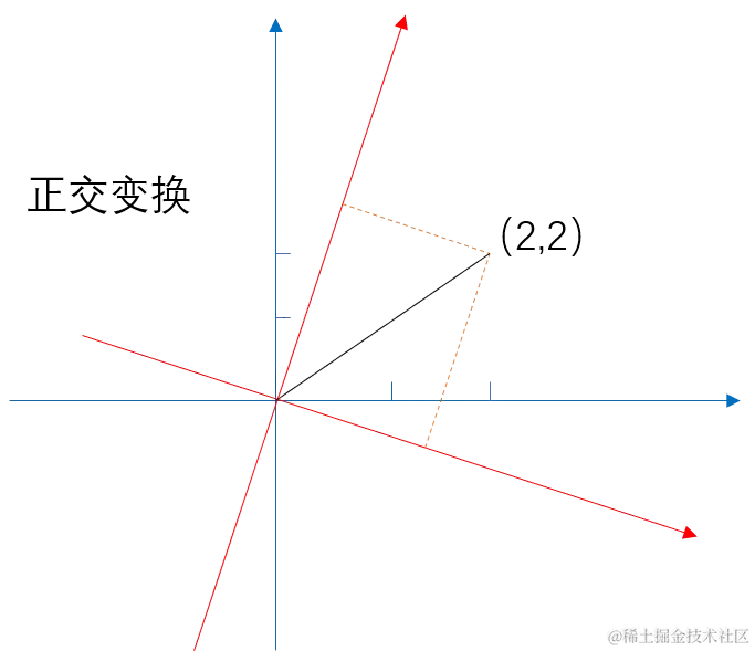 上图中蓝色坐标轴是原来数据的坐标轴,坐标上有一个点(2,2);经过变换后得到红色坐标轴,这个点的位置没有发生改变,但是点的坐标变化了;这样就可以将我们的数据变成另外一个值了。