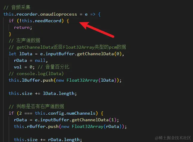 接着,我们监听ScriptProcessorNode的onaudioprocess事件就可以了,这个事件就算录制中的事件