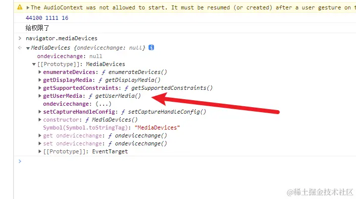 然后它的原型链上面,是有一个getUserMedia来获取媒体