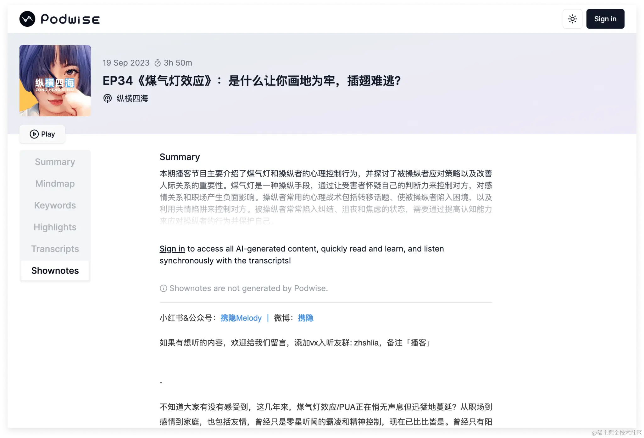 上下班的路上偶尔会听一些播客,不过听到了很多不错的内容也只是听完就过了,看到啊这个工具可以通过 AI 对播客内容进行 转录、提取、总结、分析等一系列操作,同时与 Notion、Readwise 等平台的打通,可谓是喜欢听播客的神器了,记录备用。