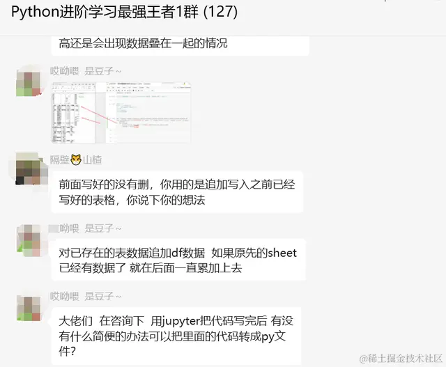 【提问补充】温馨提示,大家在群里提问的时候。可以注意下面几点:如果涉及到大文件数据,可以数据脱敏后,发点demo数据来(小文件的意思),然后贴点代码(可以复制的那种),记得发报错截图(截全)。代码不多的话,直接发代码文字即可,代码超过50行这样的话,发个.py文件就行。