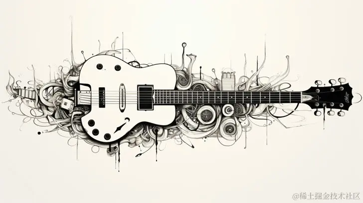 一张吉他的图像以简洁的线条为特色,展现了一种巨大规模的绘画风格。这幅作品在线条的运用中,巧妙地融入了Mommy's on-the-phonecore和Caninecore的元素,呈现出一种独特的绘画风格。