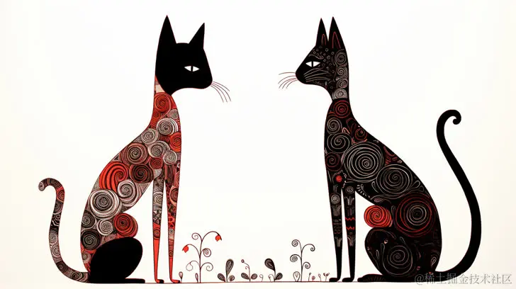 以优雅而清晰的黑色轮廓为特色,呈现出一种独特的图形化风格。这种简练而强烈的线条,不仅突显了猫咪的造型,同时也赋予整体画面一种现代感和艺术感。
