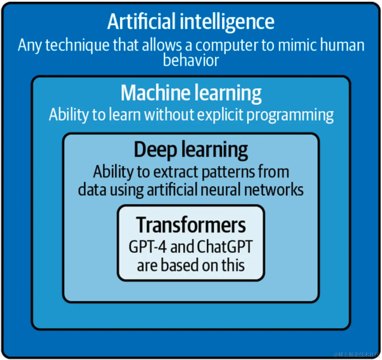 作为 LLM,GPT-4 和 ChatGPT 是 NLP 领域的最新模型类型,而 NLP 本身就是机器学习(ML)和人工智能的一个子领域。在深入研究 GPT-4 和 ChatGPT 之前,有必要先了解一下 NLP 及其相关领域。