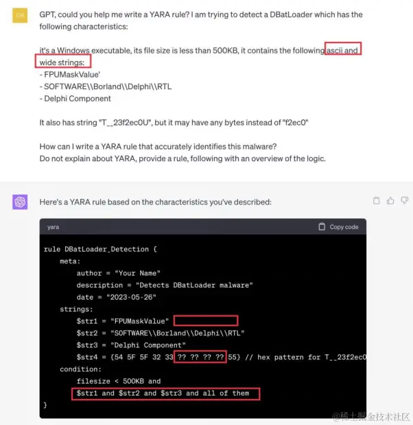 在截图中,ChatGPT并未指定字符串可以使用ASCII和wide两种编码中的具体哪一种,并且在$str4字符串中遗漏了一个额外的问题。不过,这些对于一个能够在几秒钟之内生成的规则而言,足以令人印象深刻,且加快后续工作进程了。