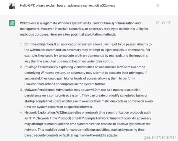 话说回来,ChatGPT在恶意软件分析方面的更常见用例在于,能够更多地了解不同的威胁,并采取的具体行动。例如,在下面的示例中,我们向ChatGPT询问了恶意软件利用合法实用程序w32tm.exe的方式,该聊天机器人给出了如图所示的可靠回答。