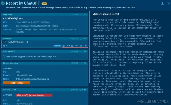 上图展示的是由ANY.RUN检测到的、借助人工智能生成的针对恶意进程的报告。凭借它,您可以全面地了解恶意软件执行某项活动的方式和原因,以及它对于基础架构安全性的影响。